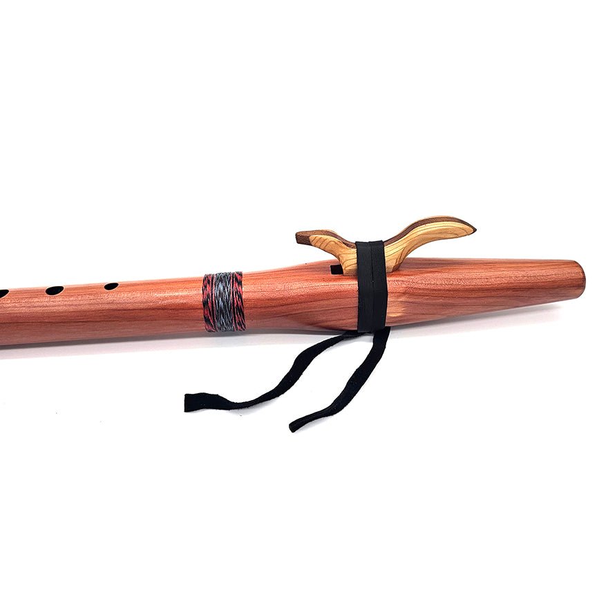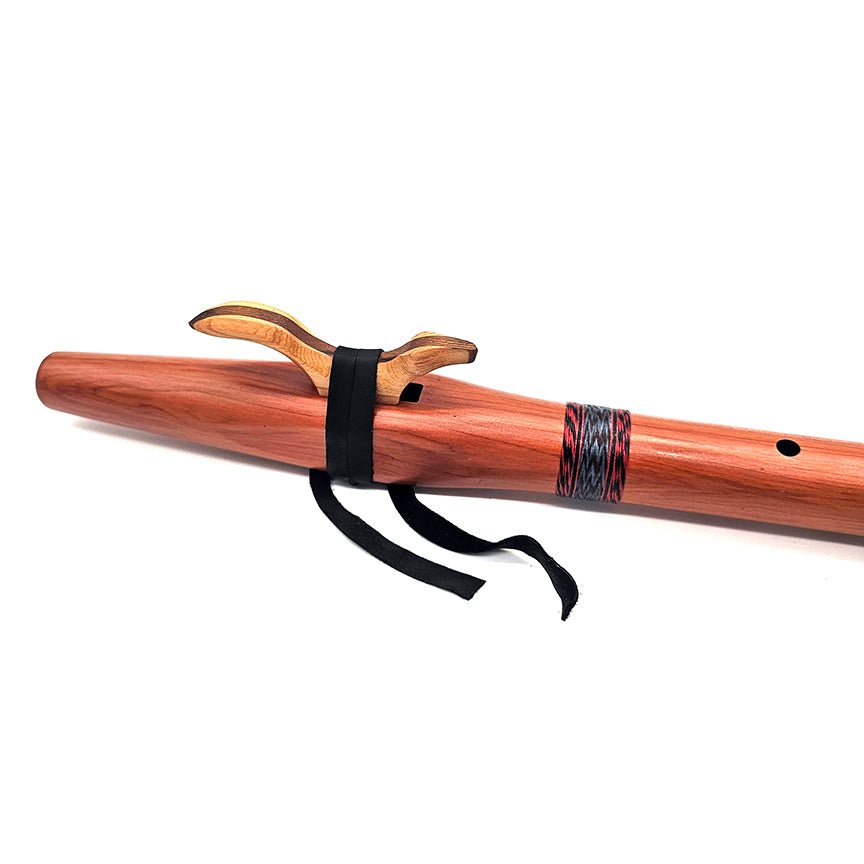 I chose dark red and sage blue for the hand woven cotton wrapping to emphasize the red color of the flute. Featuring our signature animal shaped block and a durable black elk leather tie, this intermediate level flute is sure to be your favorite!