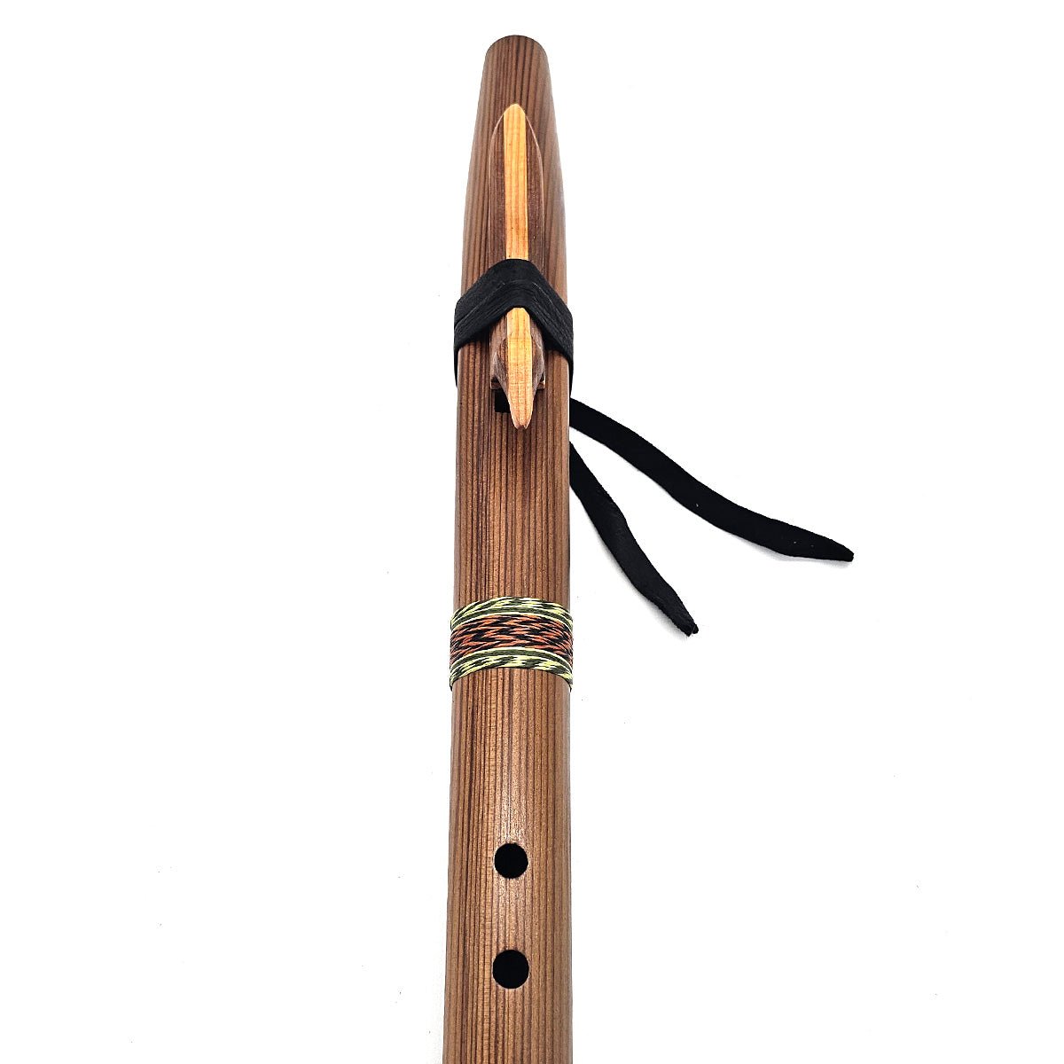 Our Premiere Native American F# (the # symbol represents a Sharp sign in musical notation) flute is tuned to the pentatonic minor scale in the key of F# which means the highest and lowest notes on this flute will play the key of F# (not including overblow notes). These are medium sized flutes measuring 24 inches long (60.96 CM) . This is the lowest key I recommend for beginner flute players. It has a larger finger stretch, especially on the bottom three holes, than our G and A flutes. This key of flute is suitable for most adults with large or flexible hands. Adults who have played other instruments are usually successful playing flutes in this key because of their improved dexterity. Flutes in the key of F# are lower in pitch than the key of G flutes. I find that many people are drawn to the lower sounding flutes. The F# flute has a soothing and low voice.