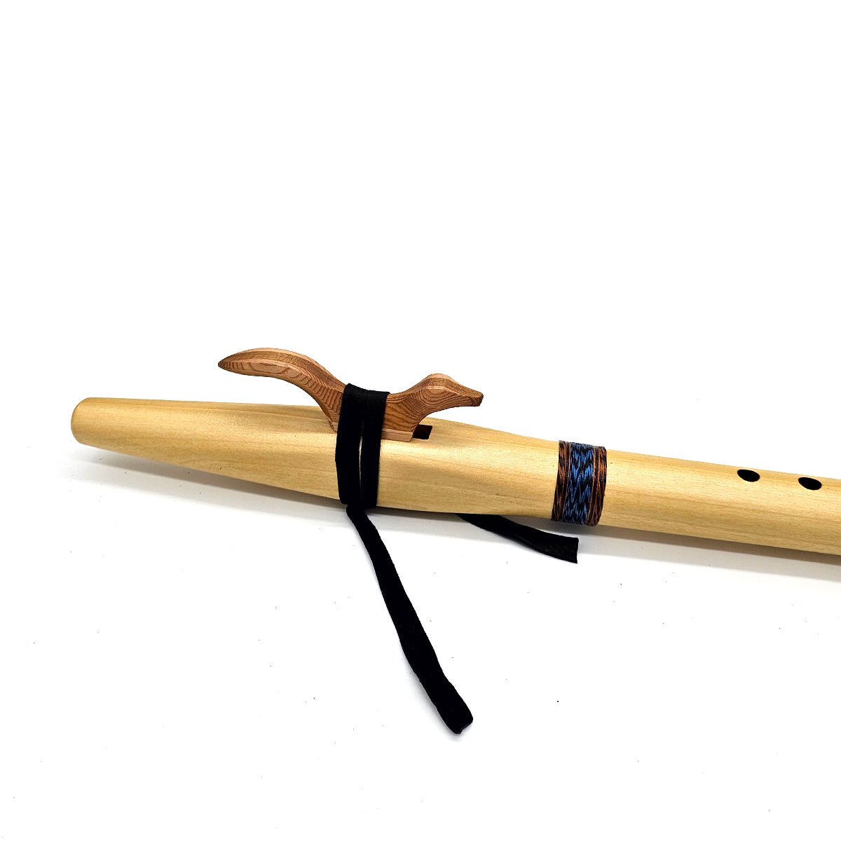 Let the low and soothing tones of this poplar Native American style f sharp flute carry you away. The medium density wood lends a soothing and gentle quality to the voice of flute. The glue we use on our flutes tends to react to this wood causing the glue line to have a subtle red appearance, this may bother some people so take a look at the pictures to see what you think before purchasing.