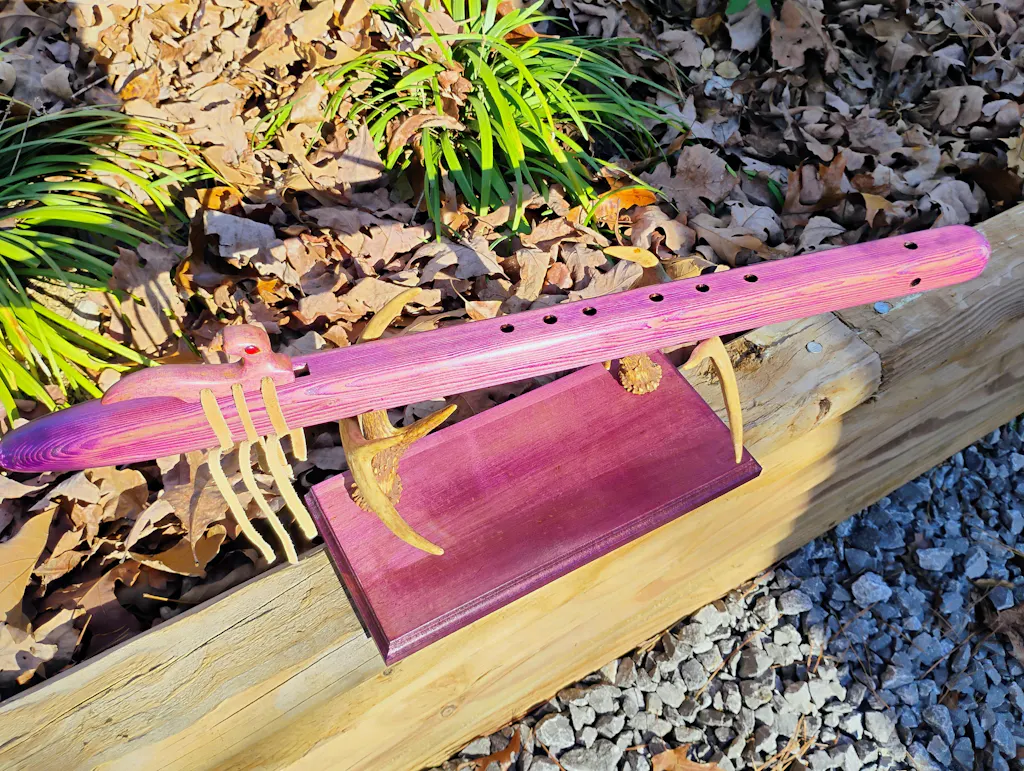 Native American style flutes in the key of F# have a low and soothing voice. They are a great key for beginners however might not be a good choice for someone with small hands. The fingering hole stretch is a little longer on and F# flute then it is on a G or an A flute.
