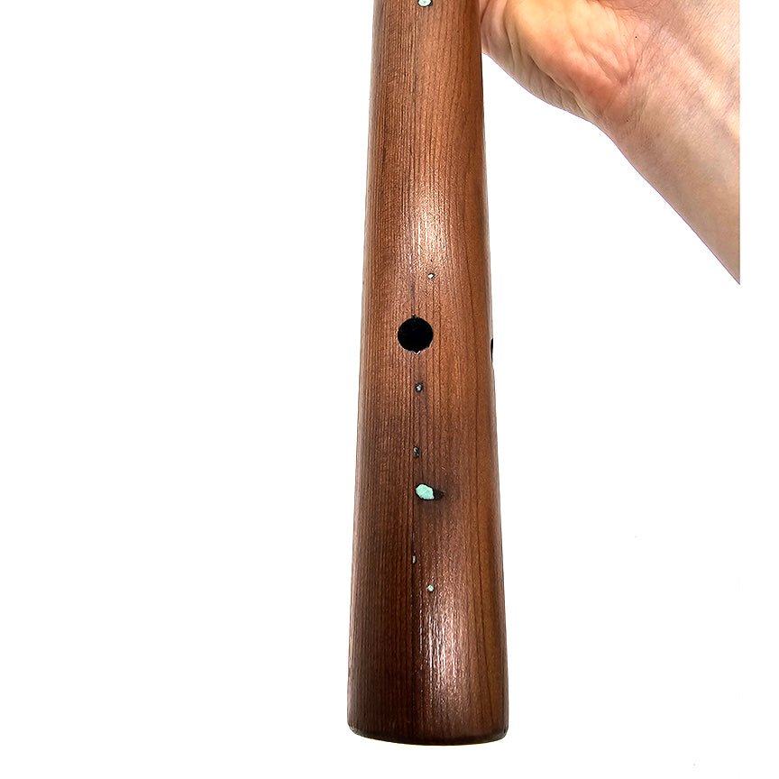 The rich red brown cedar with turquoise filled bug holes will remind you of this flutes previous life as a tree. The warm and smooth tones of its voice will sooth your mind as you play. This light weight, softwood is sacred to many PNW tribes, and it lends a wonderful resonant quality to the voice of the flute. If you are looking for a flute with a smokey and smooth voice, this is the one for you. Truly a delight to play.