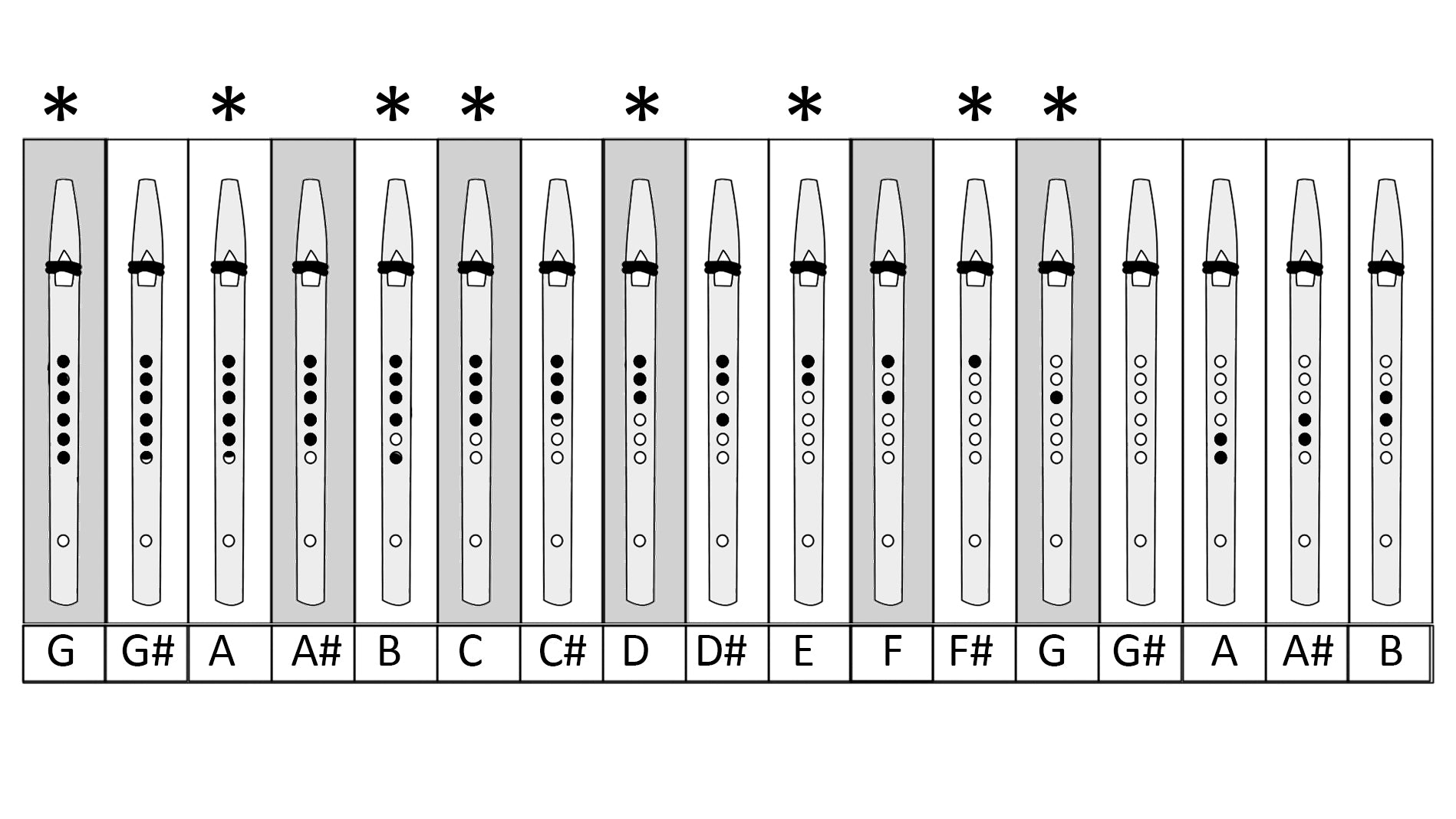 If you play every note pictured, you will be playing one octave and three notes of the “chromatic scale”. This scale takes a lot pf practice and we usually recommend you learn other scales first. This is all the notes your flute will play. The top three notes are achieved by blowing much harder and some flutes will not play the highest note pictured. The notes of the chromatic scale in the key of G are: G, G#, A, A#, B C, C#, D, D#, E, F, F#, G