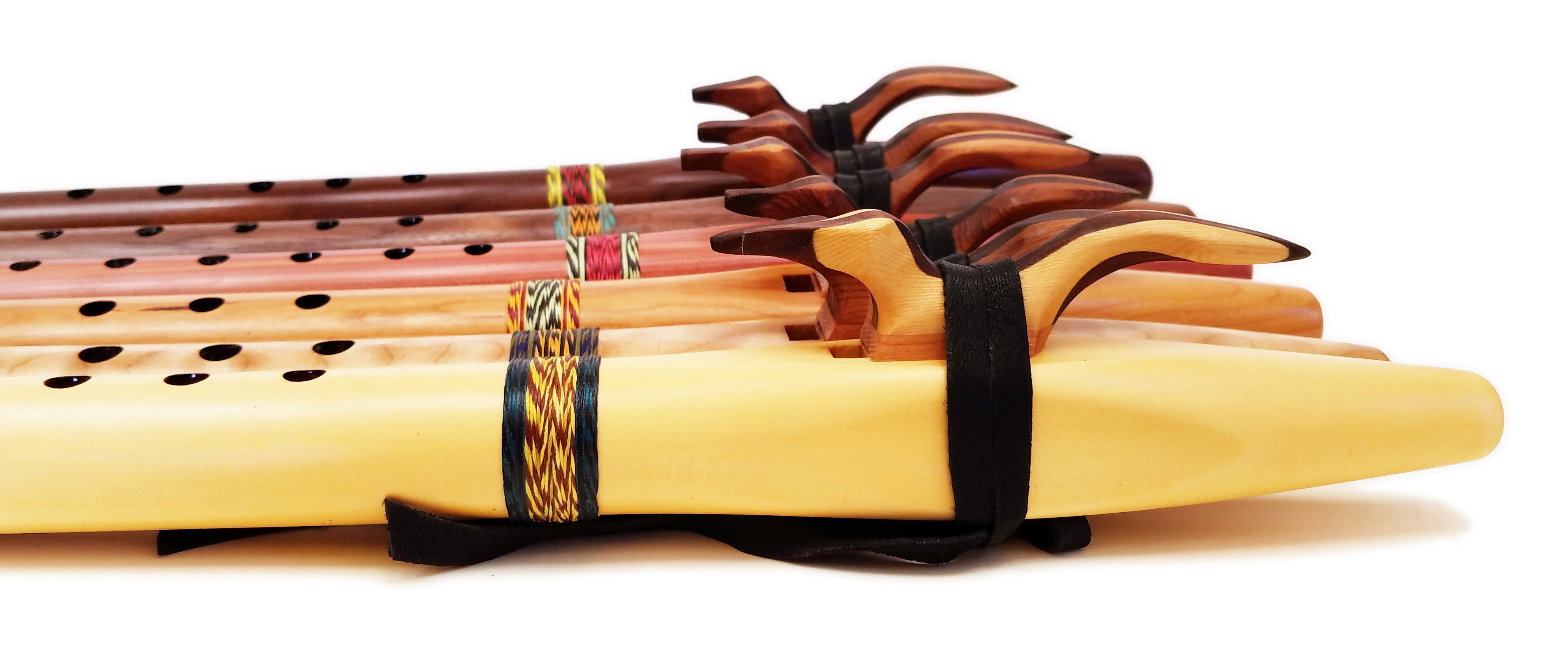 The Premiere flutes offer customers a more individualized and unique flute. Each one is photographed and demonstrated in a video so you can hear and see the flute you are buying. They are made from unique and beautiful woods and are available in a wide range of keys. They feature a hand wrapped colorful decoration and a decorative block in the shape of a stylized animal, we call it a Stellar bird. The Premiere flutes have two additional
