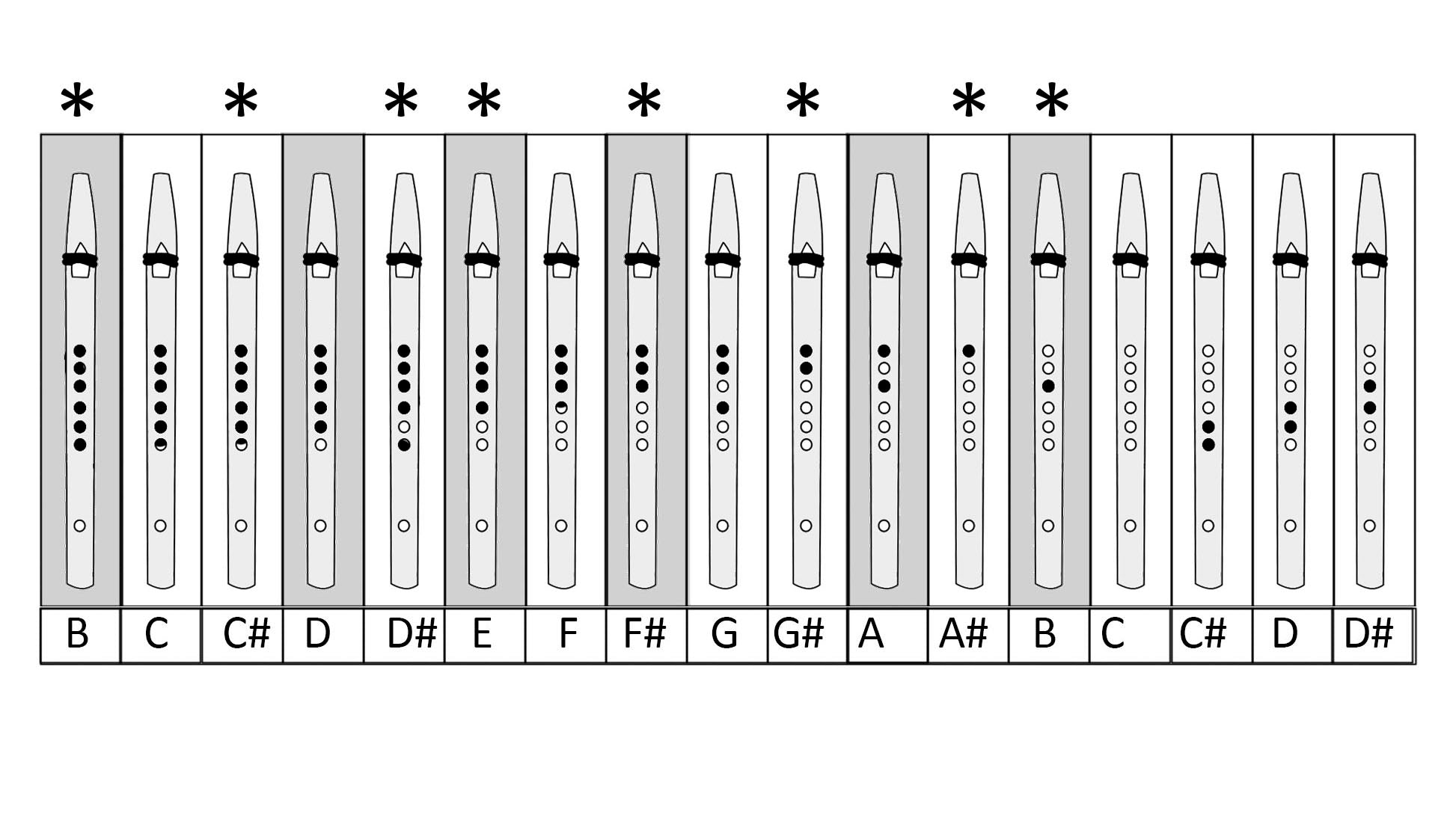 If you play every note pictured, you will be playing one octave and three notes of the “chromatic scale”. This scale takes a lot pf practice and we usually recommend you learn other scales first. This is all the notes your flute will play. The top three notes are achieved by blowing much harder and some flutes will not play the highest note pictured. The notes of the chromatic scale in the key of B are: B,C, C#,D, D# E,F,F#,G, G#, A, A#, B