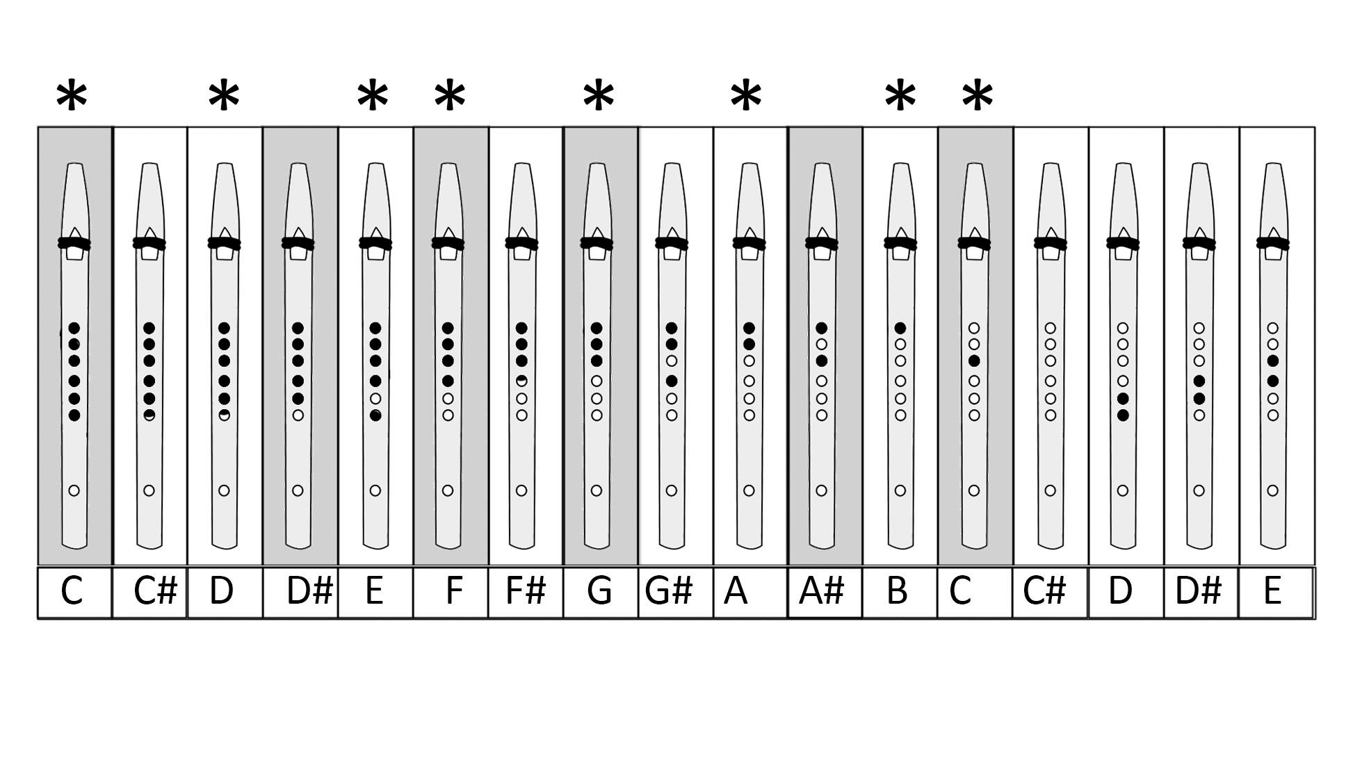 If you play every note pictured, you will be playing one octave and three notes of the “chromatic scale”. This scale takes a lot pf practice and we usually recommend you learn other scales first. This is all the notes your flute will play. The top three notes are achieved by blowing much harder and some flutes will not play the highest note pictured. The notes of the chromatic scale in the key of C are: C, C#,D, D# E,F,F#,G, G#, A, A#, B, C