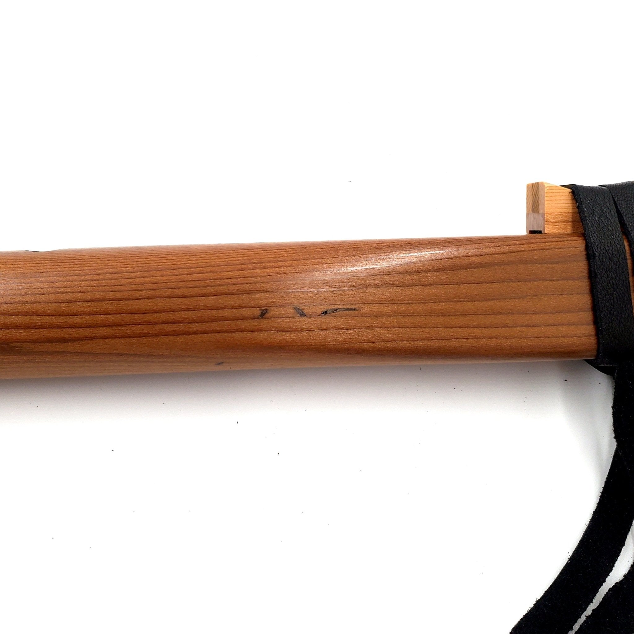 This flute is about 21 ½ inches long, 9 ½ inches from the mouth end to first hole, and the holes are 1 inch apart center to center.
