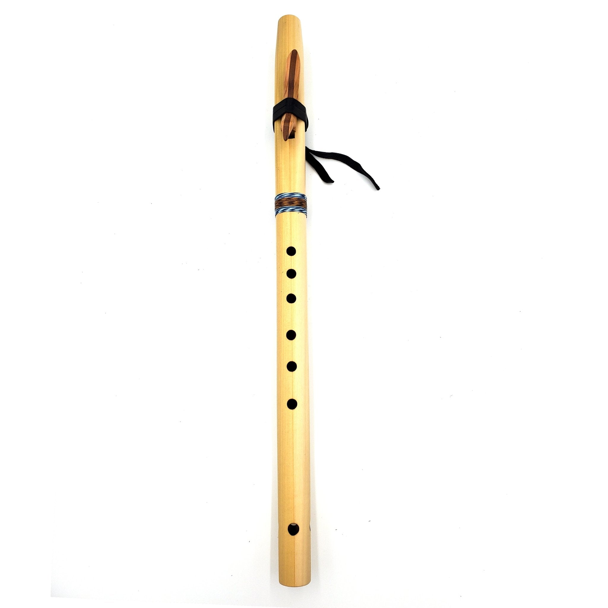 This flute is 24 inches long with a 7/8 inch bore. The fingering holes are (from center to center) approximately 1 1/8 inch apart. The distance from the mouth end of the flute to the first finger hole is approximately 10 ¾ inches.