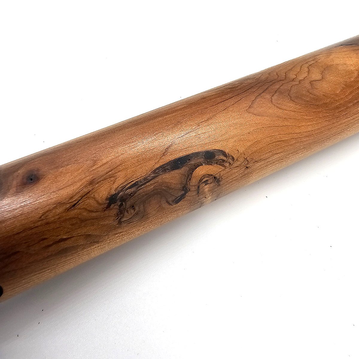 Take a moment to listen to the rich and full tones of this western red cedar Native American style flutes voice. This flute has an unusual marking, a swirl in the grain that looks like a raven in my opinion. Take a look at the second picture and see if you agree. The lightweight wood lends such a wonderful resonance to this flute. A vibration you can feel in your hands and chest as you play. This piece of western red cedar is a very dark red brown color with beautiful waves and character in the grain. Truly a pleasure to play and look at!